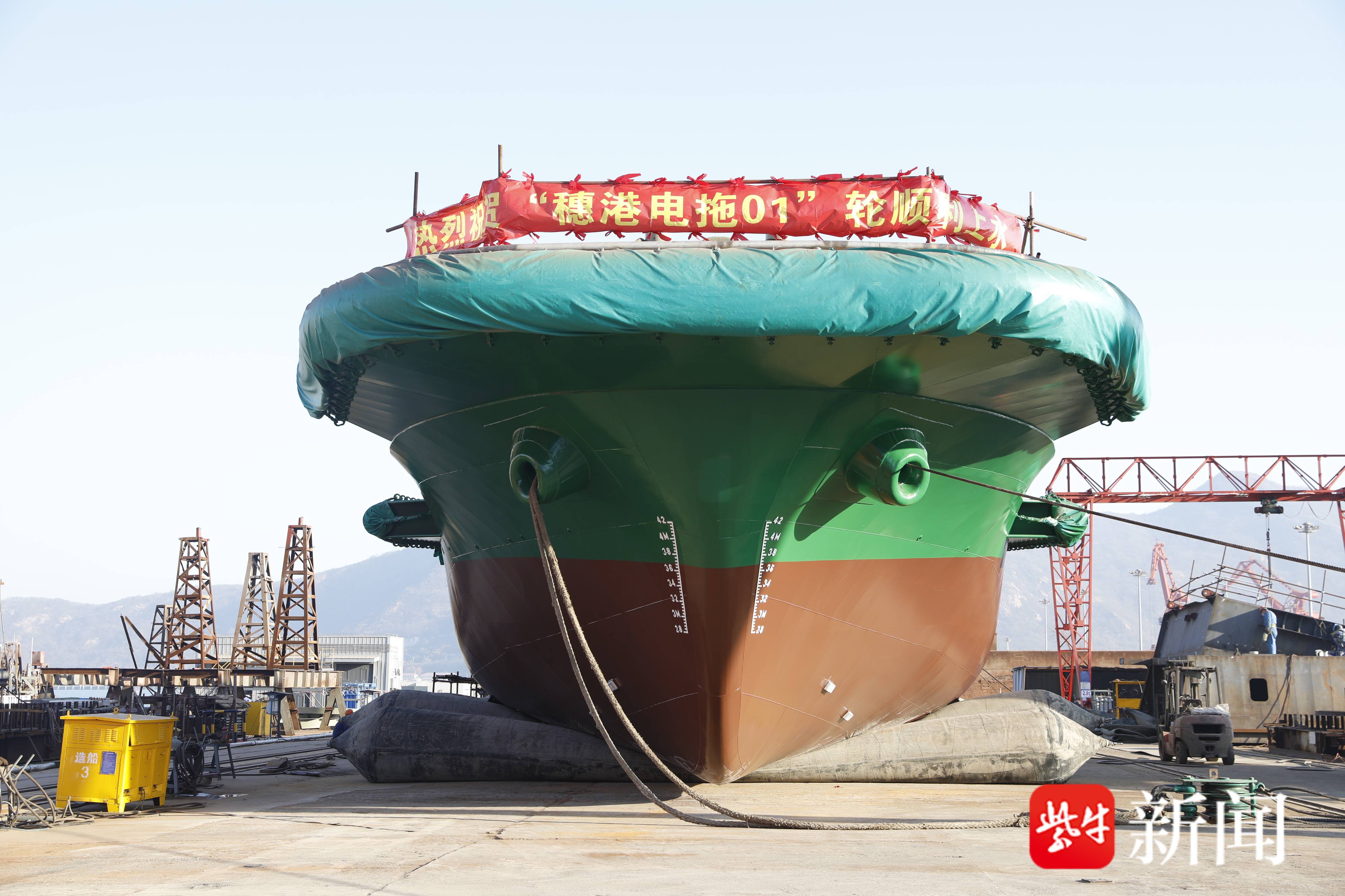 12月16日,由连云港港承建的华南地区首艘纯电拖轮广州港“穗港电拖01”轮主船体在连云港港纯电拖轮产业示范基地胜利上水,该形式为连云港港“EPOT”(易舶得)纯电拖轮品牌对外承建的首个订单。