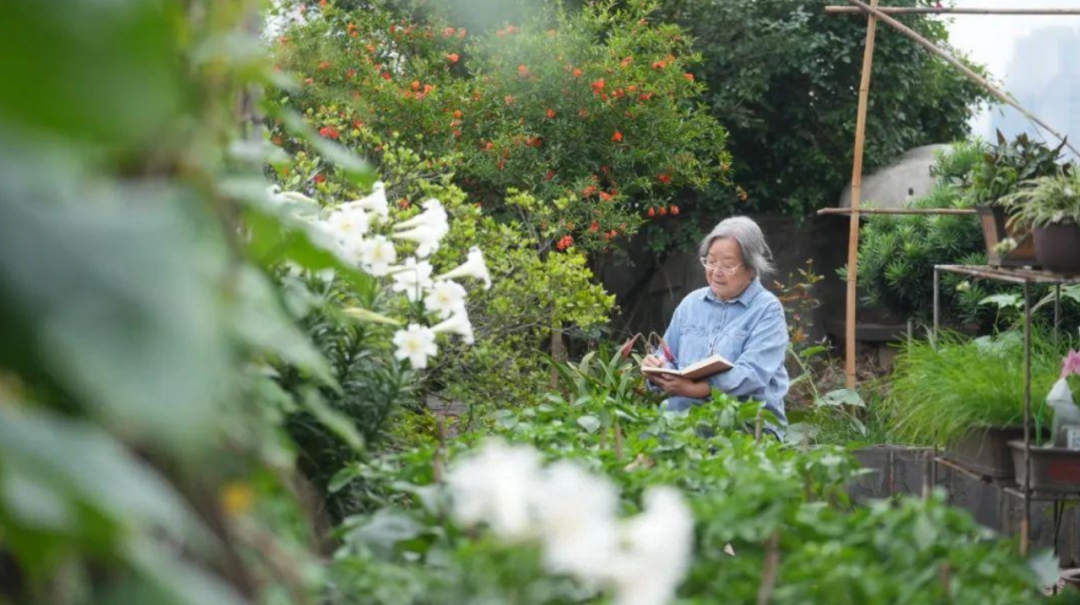 蔡皋的天台花圃,被她种满了花卉瓜果,紫藤萝、红月季、白栀子……仿佛是一个小小的极乐全国。