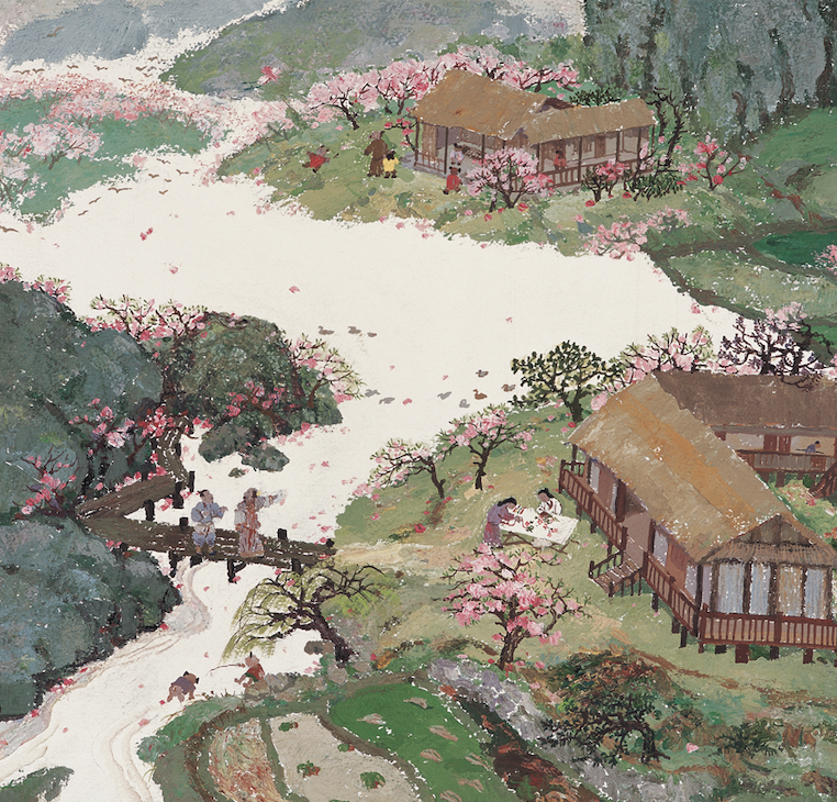 从蔡皋的画作中,得以窥见千百年来东谈主们心之所向的设想之地,似乎还能闻到绽开桃花的香味。