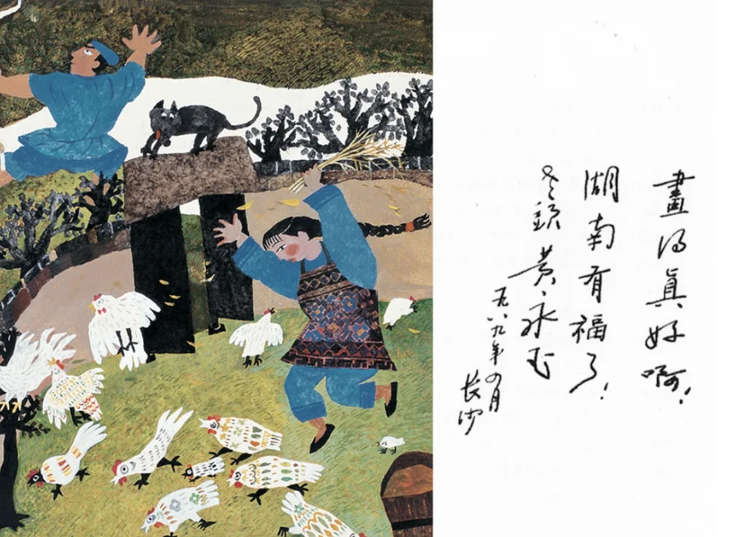 ▲ 绘本《晒龙袍的六月六》插图及黄永玉先生评价