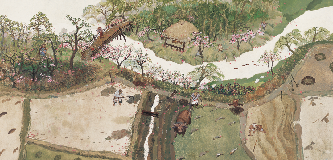 扁舟在山水间漂浮,农东谈主在原野里劳顿,桃花开得明媚饱和,桃花源东谈主活得恬淡当然……