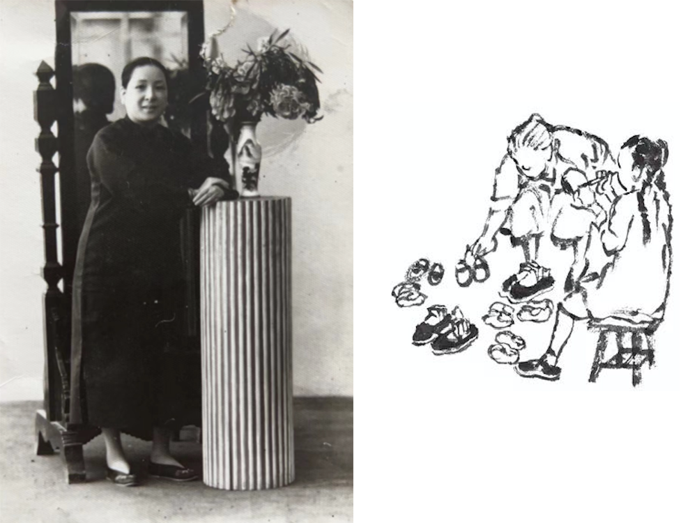 ▲ 蔡皋外婆(左);蔡皋作品“帮外婆纳鞋底”(右)